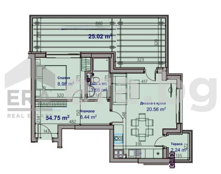 ЕРА Визия предлага за продажба двустаен апартамент разположен на 15 етаж в седемнадесететажна тухлена кооперация в кв.'Младост' на етап Акт 14. Имотът е със застроена площ 54,75 кв.м (95,98 кв.м с общите части) и включва: коридор (8,44 кв.м), дневна с кухненски бокс (20,56 кв.м), спалня (9 кв.м), баня с тоалет (3,56 кв.м), две тераси (с излаз от дневната, съответно по 2,24 кв.м и 25,02 кв.м ).