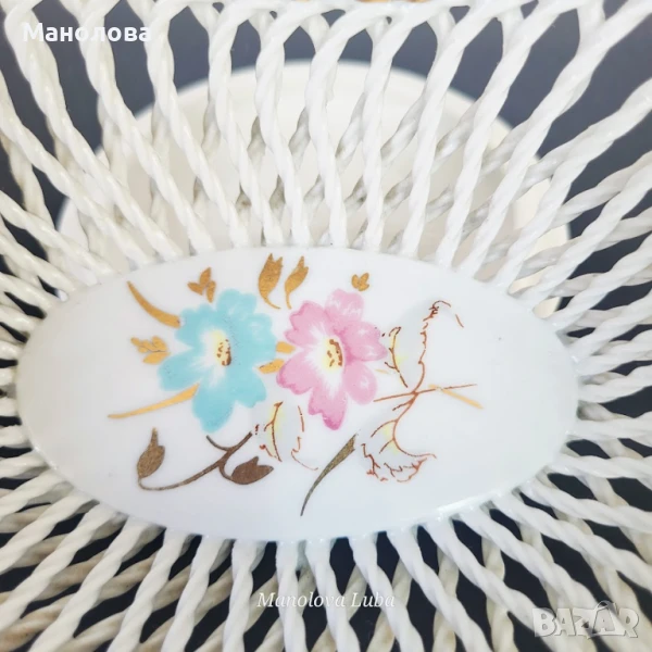 Изработена от бял порцелан, кошничката е ръчно плетена. В средата има флорална декорация. Изработена през 70/80те години на миналия век. Има забележка която се вижда на снимки 2 и 3!