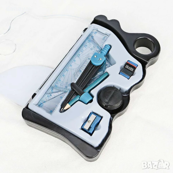 Пълен комплект за геометрия, подходящ за ученици, студенти и всички, които се занимават с чертане, математика или технически проекти. Всичко необходимо е подредено в удобна кутия за съхранение и носене.