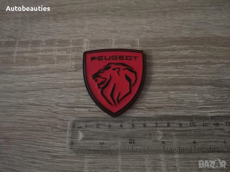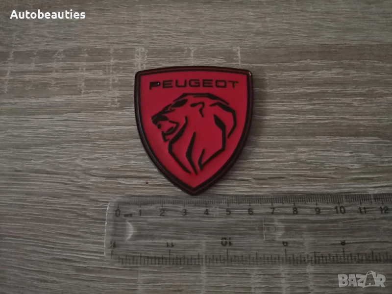 нова метална емблема за Peugeot в червено с черно. Размерът е 6 см х 6.6 см. Цената е за брой.
