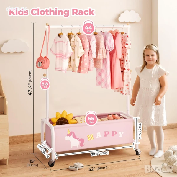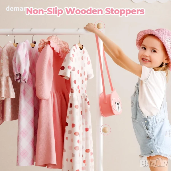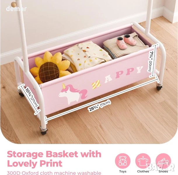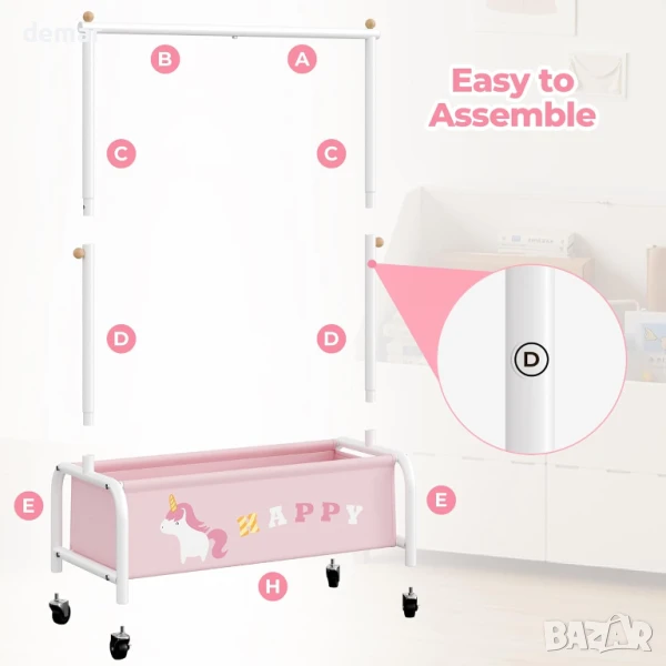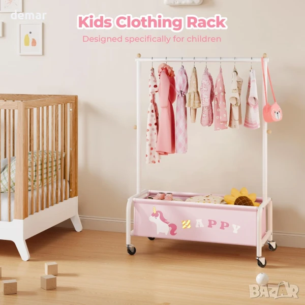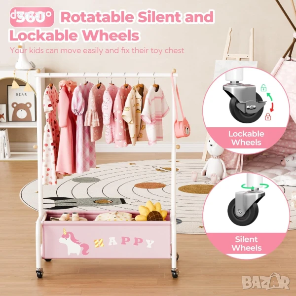 Тази детска закачалка за дрехи е със здрава, полирана желязна рамка с гладки ръбове за безопасност и издръжливост, а компактният ѝ дизайн я прави идеална за спални, стаи за игра или детски стаи. С размери за възраст от 3 до 6 години, тя е лесна за самостоятелно използване от малките деца и е достатъчно универсална, за да функционира като закачалка за кърпи или дрехи за домашни любимци. Долното отделение за съхранение добавя допълнително място за играчки, обувки или кукли, а добавянето на колелца позволява безпроблемно придвижване из дома.