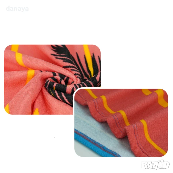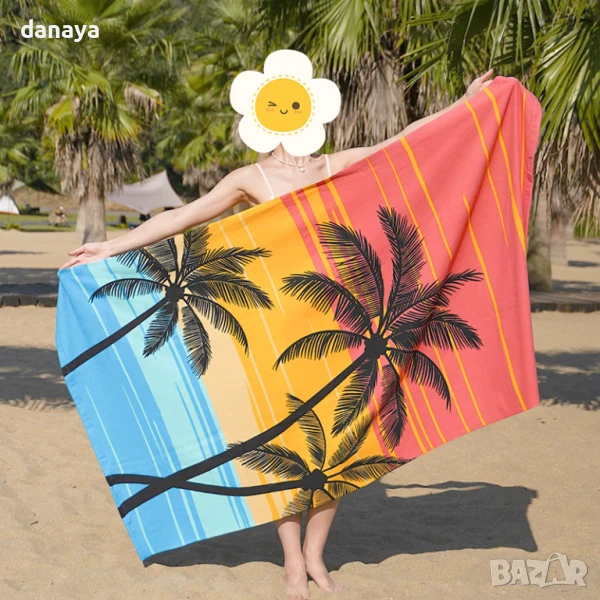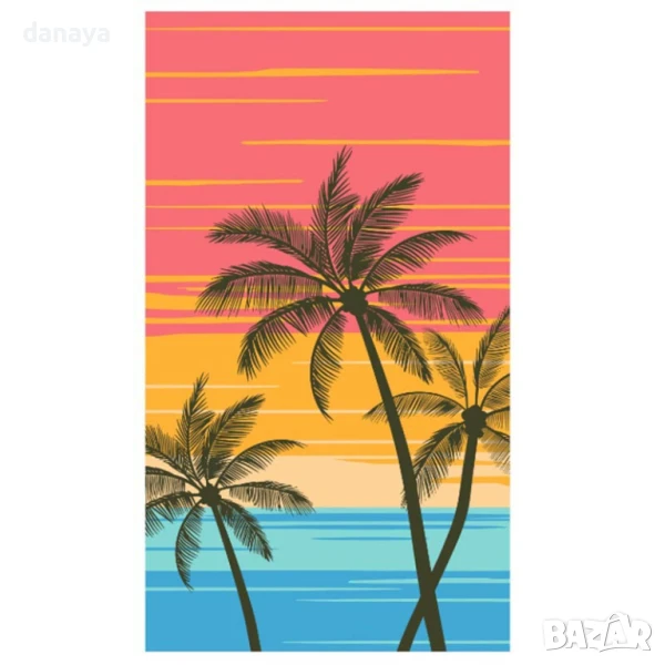 Ефектна и стилна плажна кърпа с дизайн на розов залез и силуети на палми – перфектният избор за почивка край морето или басейна. С щедрия си размер от 180×100 см, тя осигурява комфорт и пространство както за лежане, така и за подсушаване. Изработена от мека, попиваща и бързосъхнеща материя, подходяща и за използване като шал или покривало.