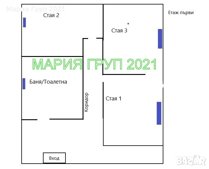 Първи етаж: три стаи, антре, баня с тоалетна!!!