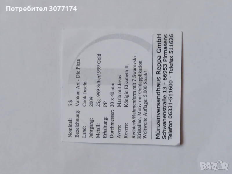 5 долара сребро острови Кук Пиета → Обява 51215328