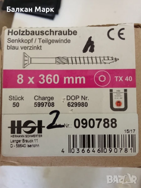 Професионални винтове за дърво(кофраж )тип "Торнадо" – HSI 8х360, 50бр Размер: 8x 360 mm