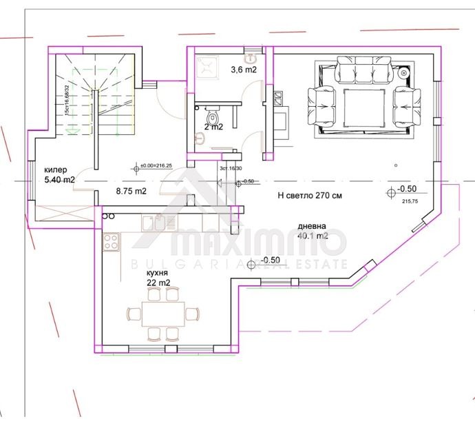 Застроената площ на етажа е 107кв.м. Височина на таван 3.30м