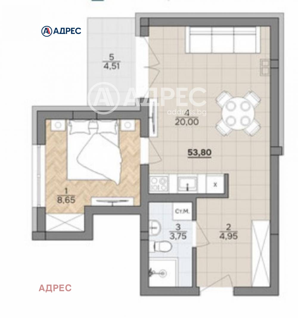 Адрес недвижими имоти предлага двустаен апартамент в новостроящ жилищен комплекс VISION, който ще бъде реализиран в средата на 2027 г. Модерен жилищен комплекс, който съчетава архитектурна естетика, уединение и внимателно планирана инфраструктура, която включва целогодишен отопляем басейн, открита фитнес зона, уютни патио пространства и сигурна детска площадка. За максимално удобство са предвидени подземен и наземен паркинг, а достъпът до територията се контролира чрез система за видеонаблюдение и контрол на достъпа.