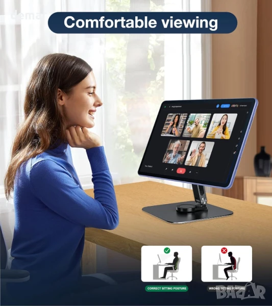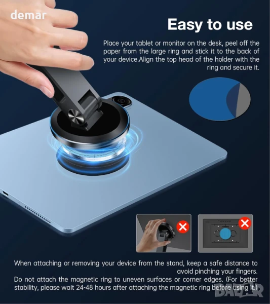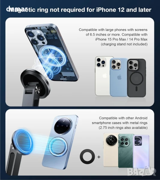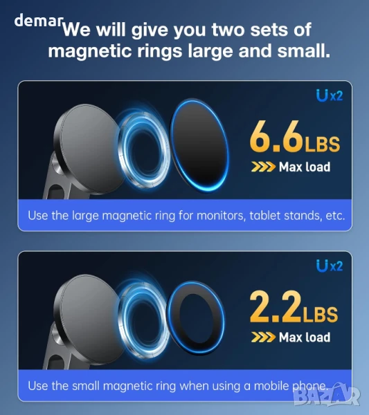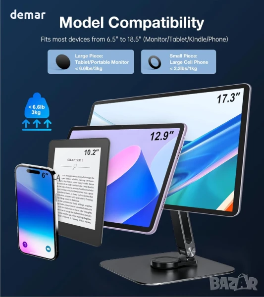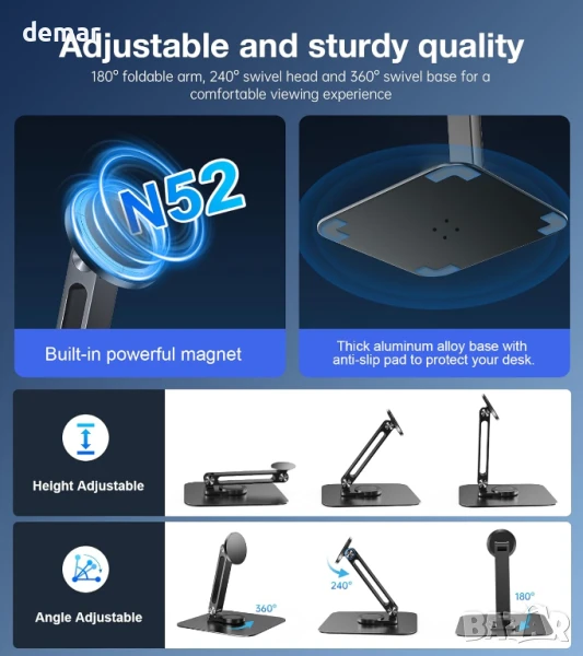 Включва магнитна стойка за таблет/смартфон/монитор с два големи и два малки метални пръстена за здраво и сигурно закрепване. Вградените висококачествени магнити предлагат бързо и надеждно захващане и незабавно заключване, когато са сдвоени с включените пръстени - някои устройства с метална задна част може да работят и без тях. Основата се завърта на 360° и се сгъва на 180°, което позволява гъвкаво регулиране на ъгъла в портретен или пейзажен режим за монитори, таблети и смартфони 6,5 до 18 инча. Проектирана за комфорт, тя повдига екраните до нивото на очите, за да намали напрежението във врата и да подобри фокуса. Стабилната алуминиева основа с противоплъзгащи подложки държи стойката стабилна. Поддържа до 6,6 фунта (3,3 кг) и работи с широка гама от таблети, iPad-и, монитори и iPhone-и; металните пръстени осигуряват захващане на немагнитни устройства.