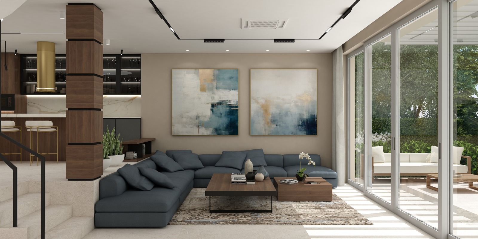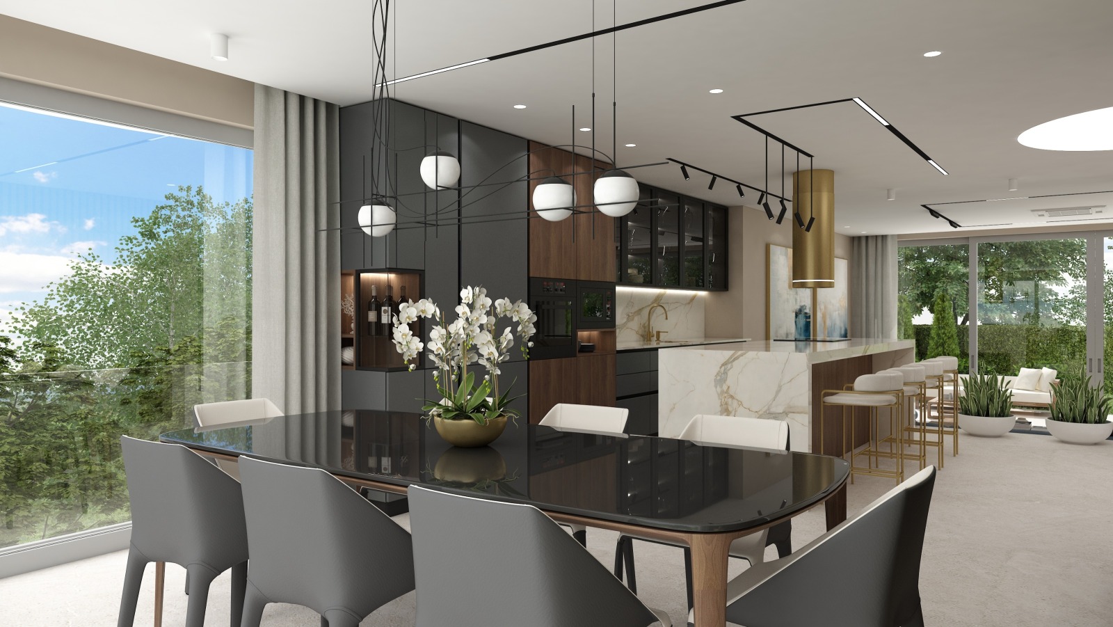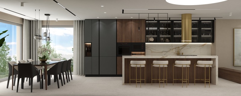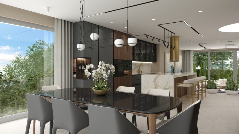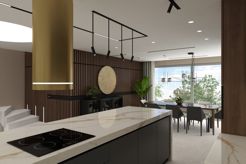 На втория етаж са разположени три спални с три самостоятелни бани. Към главната спалня има дрешник и голяма панорамна тераса.