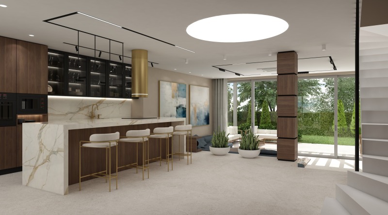 Първи етаж- просторен дневен тракт- 70 кв.м., с излаз на веранда към богато озеленен двор. Голяма кухня и трапезария, килер и перално помещение, санитарен възел и отделно техническо помещение.
