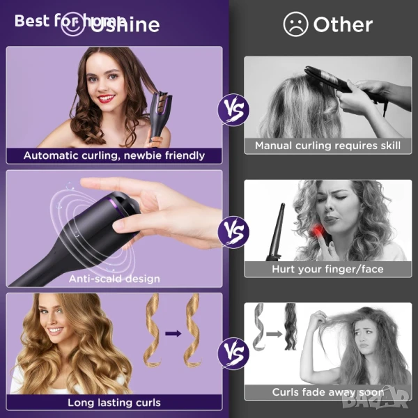 ПОДОБРЕНА ГРИЖА ЗА КОСАТА С ОТРИЦАТЕЛНИ ЙОНИ: Въртящата се маша за коса Ushine е изработена от най-новата турмалинова керамика, която разпределя топлината равномерно и излъчва отрицателни йони, които реагират с положителните в косата ви, за да се сведе до минимум матовостта и къдренето. Перфектно защитава косата ви и постига по-бляскави резултати, като същевременно заключва къдриците ви от деня до нощта. Най-добър избор за хора с къдрава или увредена коса.