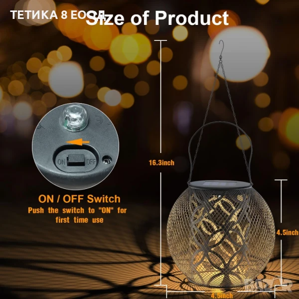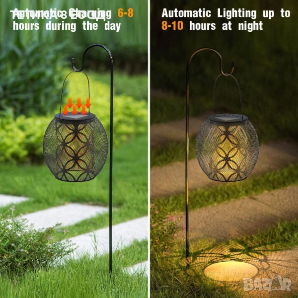 Лесен монтаж: тези соларни лампи за окачване на открито не изискват инструменти или кабели. Просто завъртете превключвателя на соларния панел на "ON", за да ги окачите или поставите, използвайте включените метални куки и вериги за окачване.