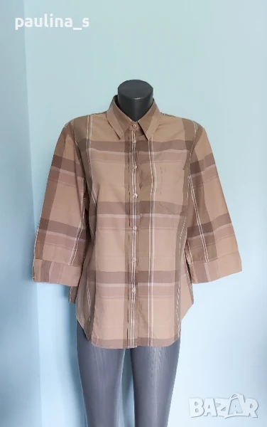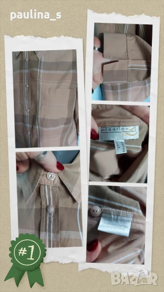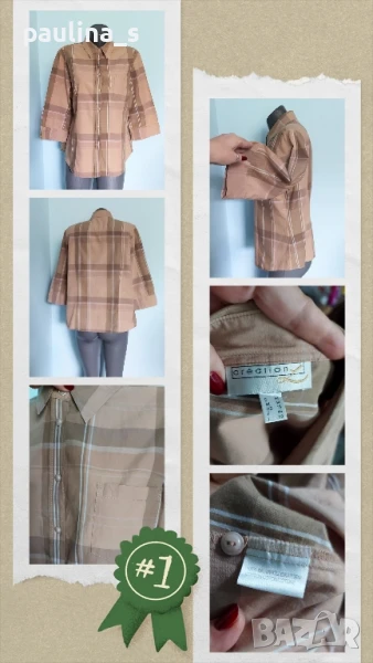 4️⃣. Колаж / XL / 2XL - "Creation L". Цената е крайна 29,99лв. Дамска вталена ризка в топлата бежова гама, каре, с 3/4 ръкавчета. Моделът е класически Boyfriend's shirt, с отворен джоб, перлени копчета до горе, неразличима от нова. Материята е 100% памук, а десенът подхожда на всичко, хипоалергична.
