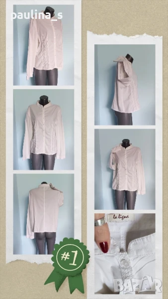 2️⃣. Колаж / XL / 3XL - "La ligna" France. Цената е крайна! Дамска дизайнерска риза. Платът е памук с ликра, има еластичност, столче яка и дантела. Отпред има по 3 вертикални наборни линии с памучна дантела. Копчетата са седефени елипси. Дрехата е много изискана и уникат, както всичко на марката! Неразличима от нова!