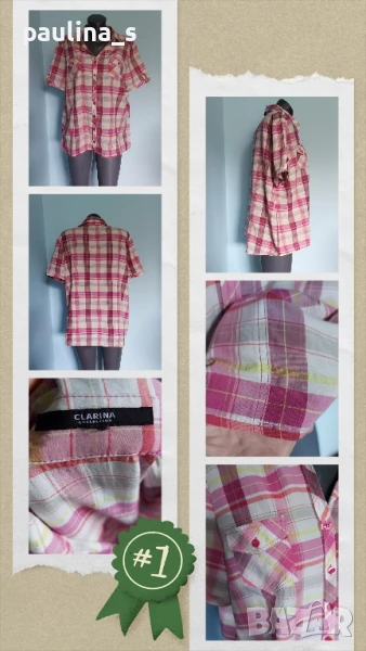 1️⃣. Колаж / XL / 3XL "Clarina" / Памучна риза тип туника. Цената е крайна 29,99лв. Разкошна дамска риза в розово каре, с розови седефени копчета, розови маркиращи тегели, втален силует и издължена задна част. Деколтето е шпиц, има два малки джоба с капаци отпред, на ръкавите има обърнати пагони. На живо е много красива и ефектна дреха. Материята е памук, много приятна за допир до кожата, без етикет. Не е чисто нова, но е без дефекти, като нова.