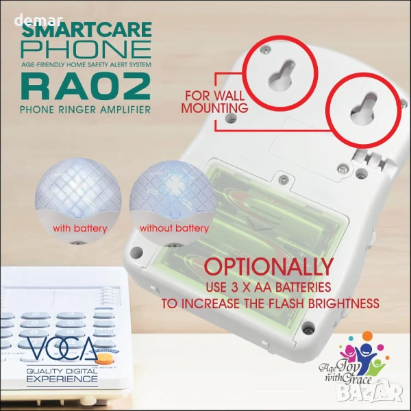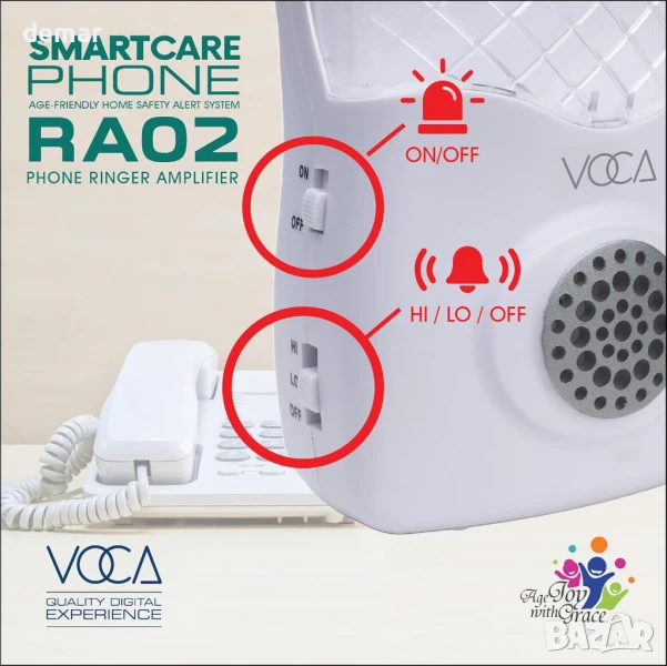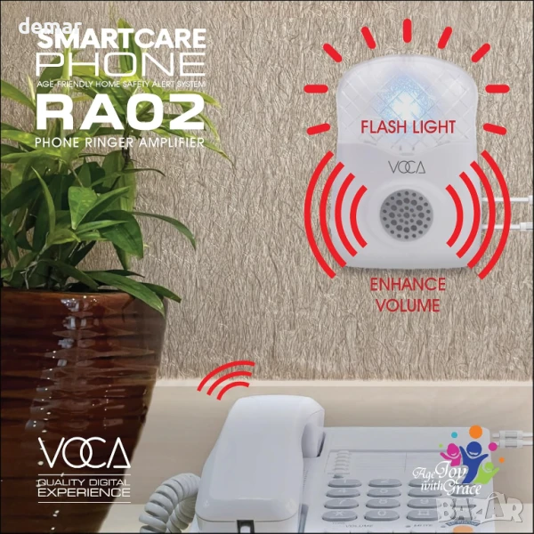 Усилвателят на звънене на телефон VOCA усилва силата на звука на звъненето на стационарни телефони до 95 dB и разполага с ярък мигащ светодиод за визуални сигнали, което го прави идеален за шумна среда или хора с увреден слух. Лесен е за инсталиране с включения RJ11 кабел, не изисква батерии или външно захранване и работи с повечето аналогови телефони и устройства, свързани с модем (с изключение на цифрови PABX системи).