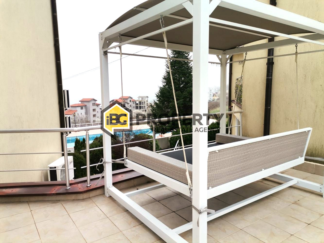 Жилището е разположено на 2-ри етаж в пет етажна жилищна сграда с асансьор. Състои се голяма дневна с кухня, кът за спане,закрита тераса, голяма баня с тоалет, спалня и втора баня с тоалет. и излас на голяма тераса. От апартамента се разкрива красива морска панорама. Предлага се с цялото налично обзавеждане и оборудване. Обща площ на апартамента 134кв.м