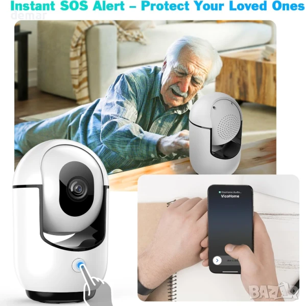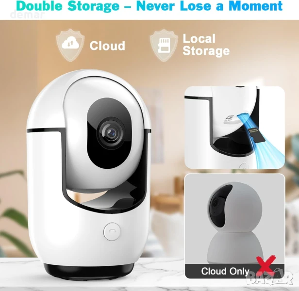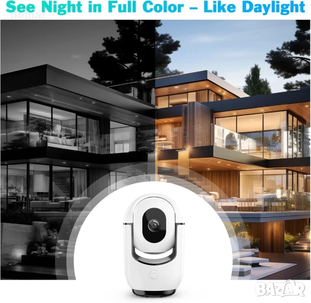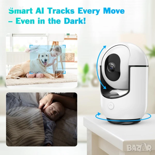 Тази вътрешна WiFi камера осигурява рязко 2K видео с цветно нощно виждане, 360° управление на панорамиране/накланяне чрез приложение и разпознаване на движение, задвижвано от изкуствен интелект, което разграничава хора от домашни любимци. Тя включва известия в реално време без абонамент, двупосочно аудио с повикване с едно докосване и поддържа съхранение както в облак, така и на SD карта за непрекъснат запис 24/7, което я прави идеална за домашна сигурност, наблюдение на бебета и наблюдение на домашни любимци.