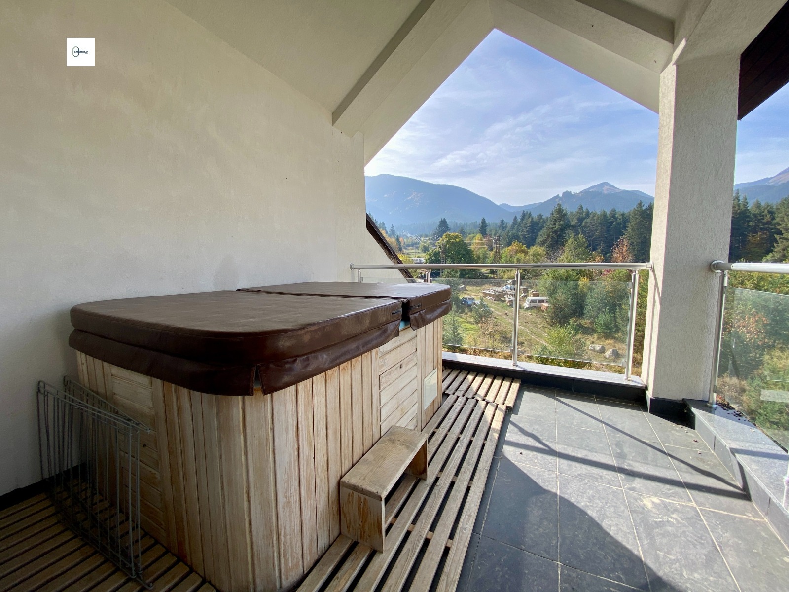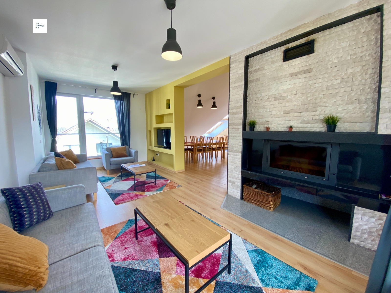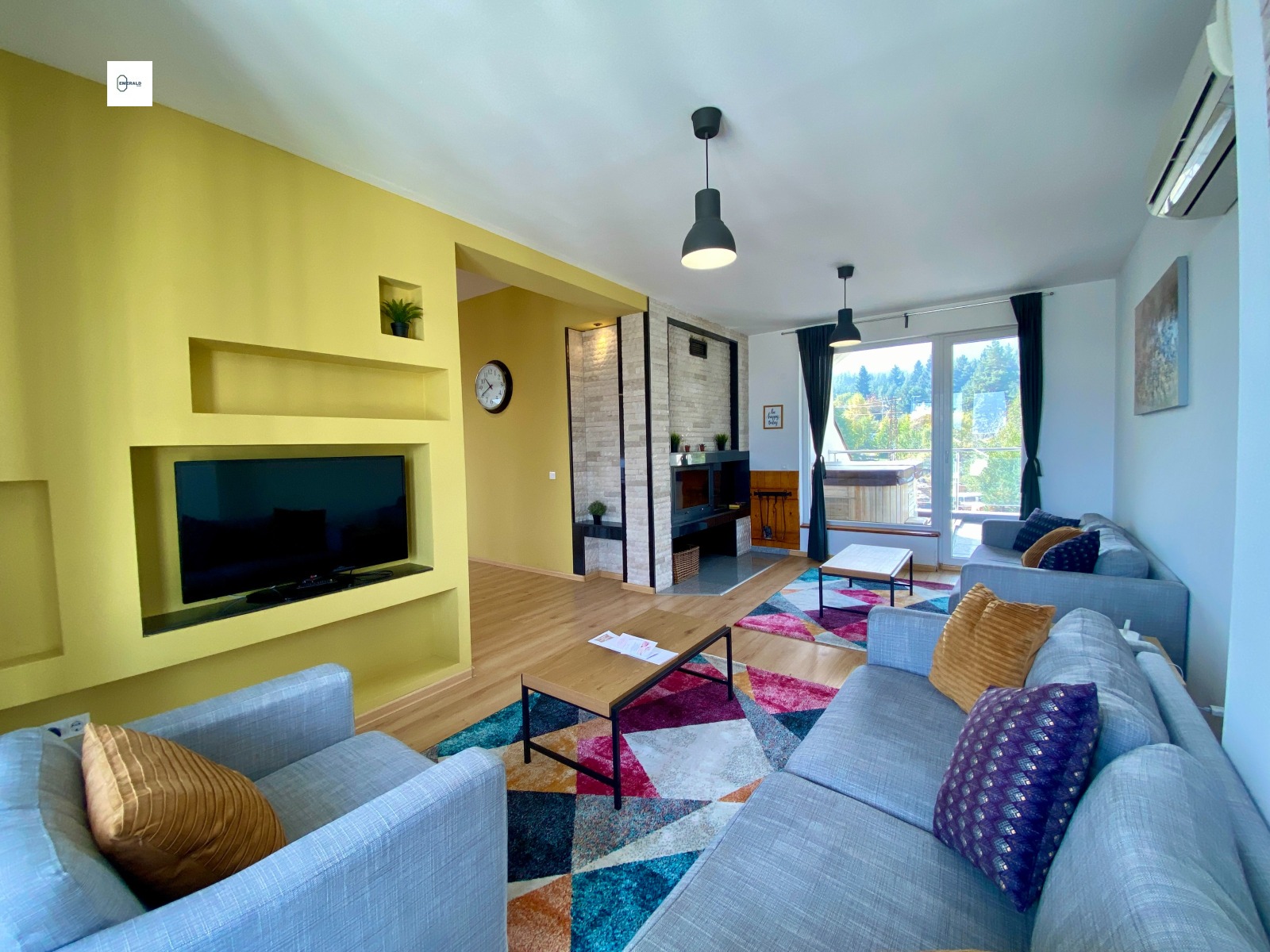 Оборудване: Апартаментът е оборудван с камина, която добавя топлина и атмосфера в голямата всекидневна. Джакузи на балкона.