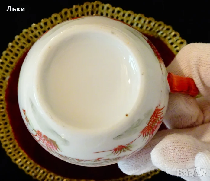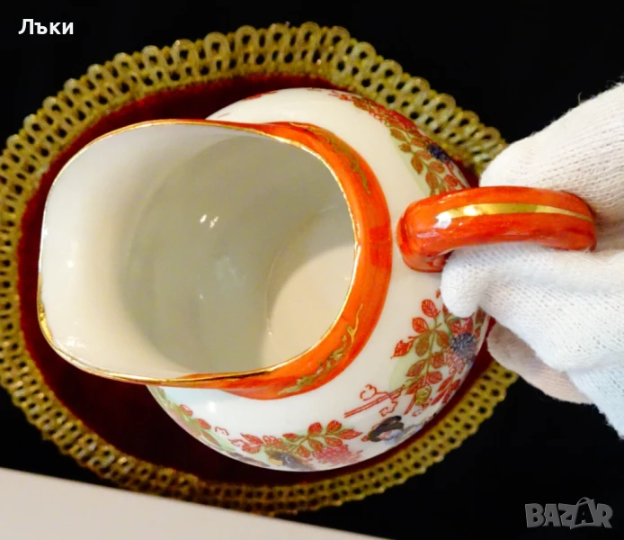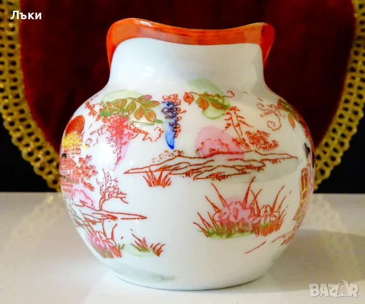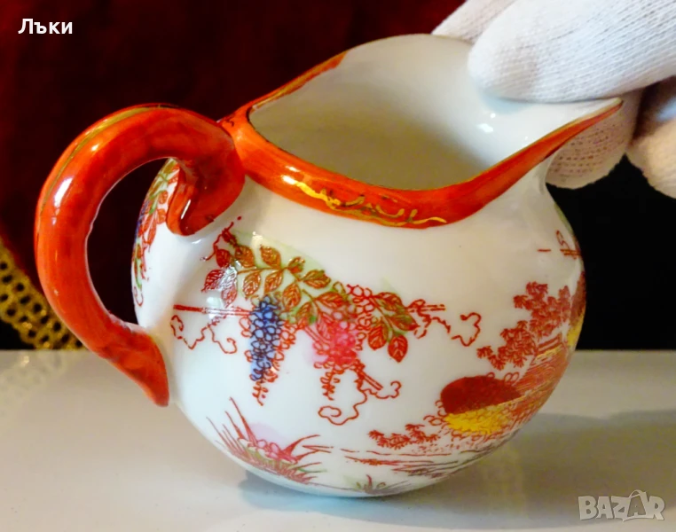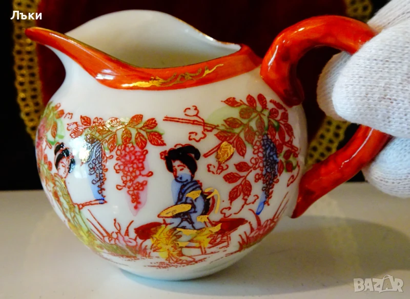 мляко,латиера,японски фин порцелан,ръчно рисувана с красив японски пейзаж – Гейши облечени с кимона в градина с пъстри цветя и фини контури от 24 карата злато.Липсва маркировка,защото е била предназначена за вътрешния пазар в