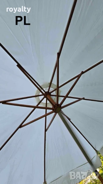 Дървеният прът е разположен извън сенника, така че да не пречи на пространството под чадъра. Градинският чадър се отваря и затваря лесно чрез манивелата.