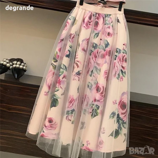 Дамски комплект в нежно бежаво.Модела се състои от памучна блуза(трико) и пола от сатен и тюл.