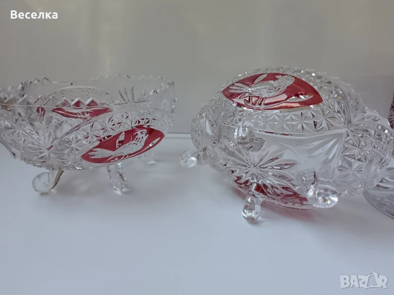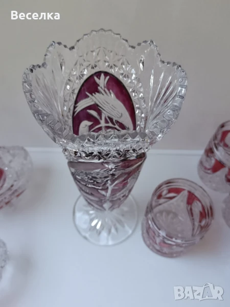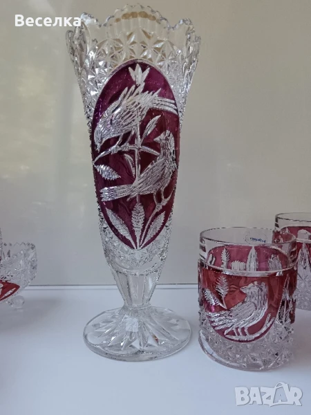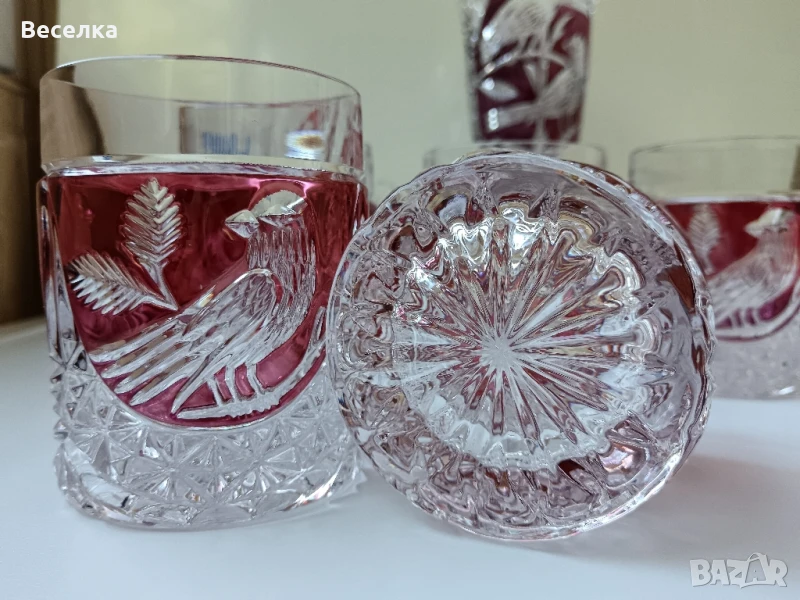 💎 Уникален и пълен оловен кристален комплект на Hofbauer за уиски. Декорация с птици и червено оцветяване. Сервиза включва: