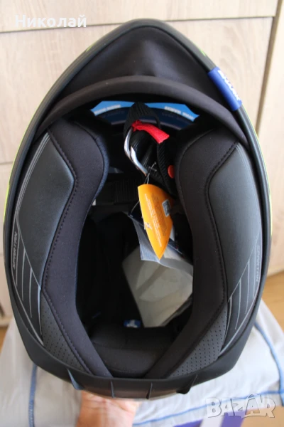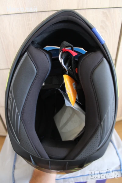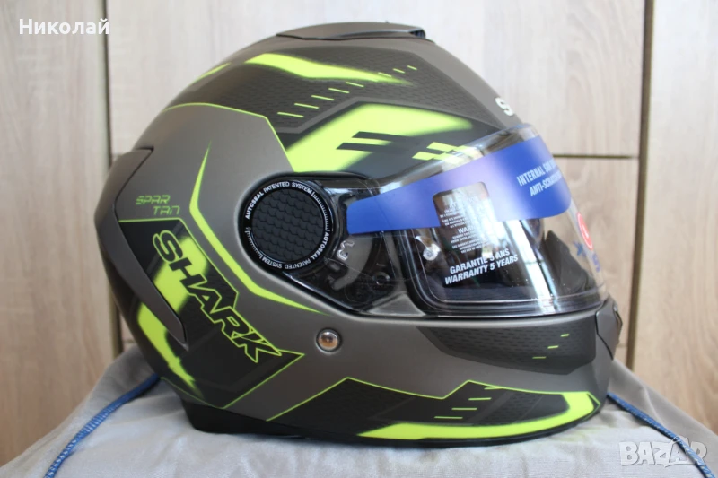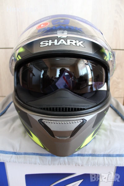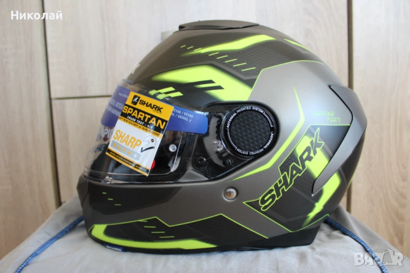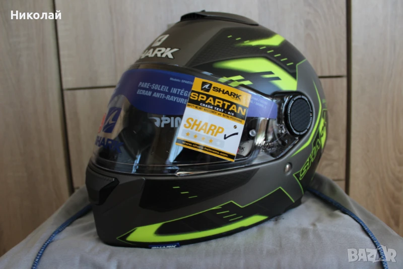 Чисто нова каска Shark Spartan 1.2, размер "L". Каската е с вградени слънчеви очила с UV защита от слънчевите лъчи, визьор с покритие против надраскаване, лесно сваляема вътрешност от материя "Microtech" с антимикробни свойства и възможност за машинно изпиране, подбраник, който се регулира в две положения - отворен и затворен и най-сигурното закопчаване с Double D ring.