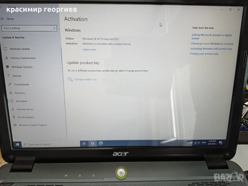 В комплекта се включват: лаптоп Acer Aspire 4730Z, батерия, адаптер, Мрежов кабел Америка САЩ, мишка с пад. С инсталиран Windows 10 IoT Enterprise LTSC 2021, чиято безплатна подръжка от Майкрософт е до 13 януари 2032 год. цената е 45 евро.
