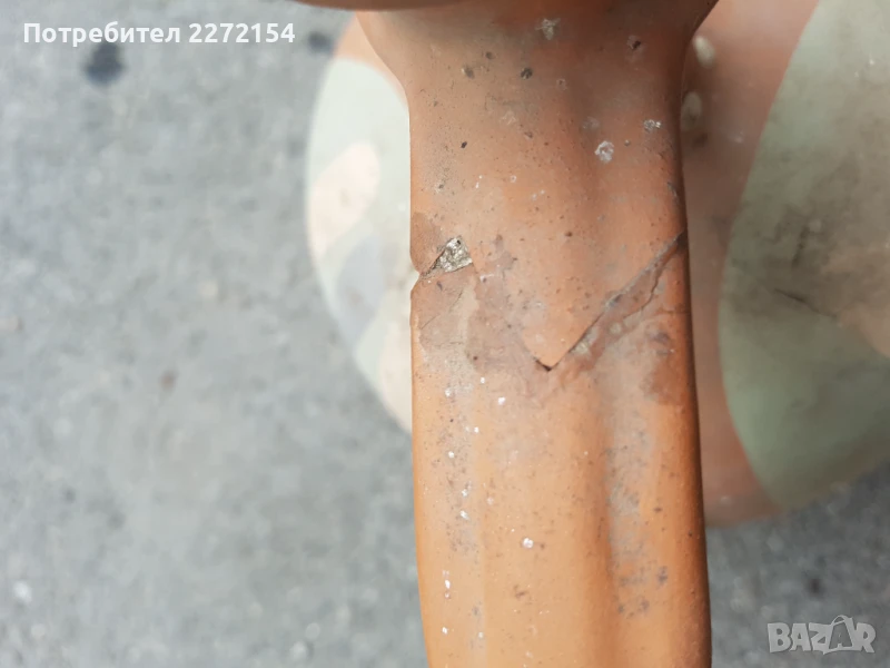 Голяма здрава стомна в горната част на дръжката има пукнатина,а отдолу я няма. Височина 33 см.
