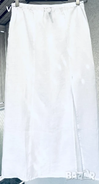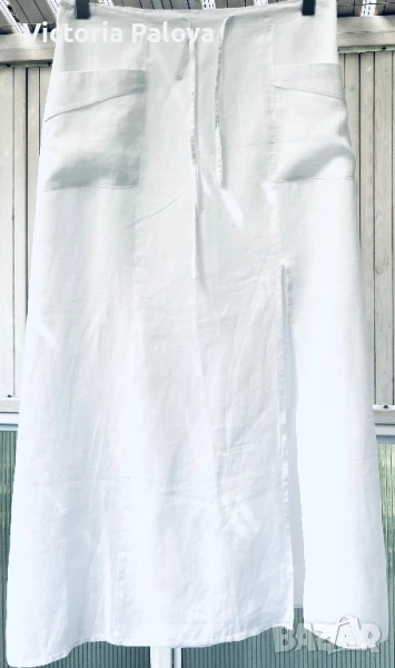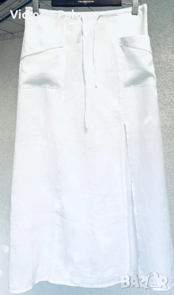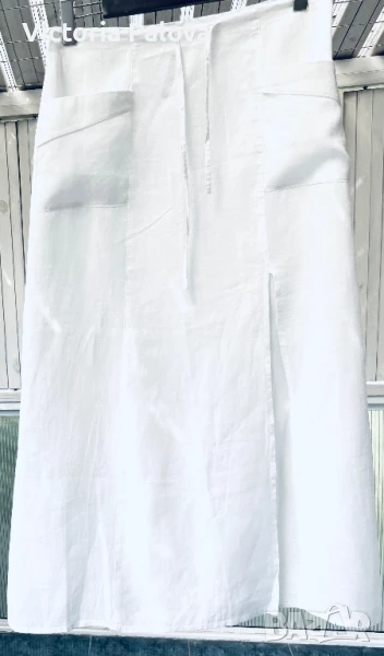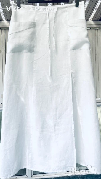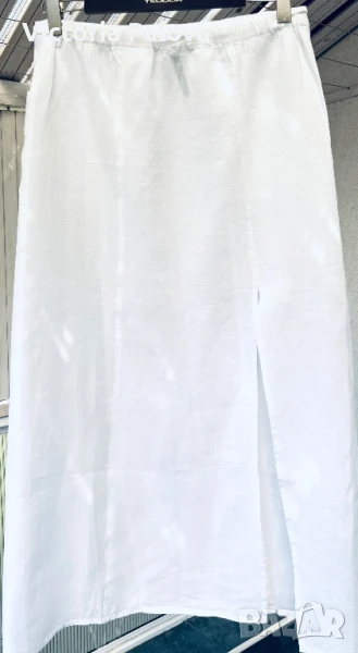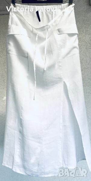 NUVOLA - елитен европейски бранд. Високо качество, удобна кройка, благородна цветова палитра, универсалност - това възхищава поклонниците. “Неповторимост и елегантност, която не остава незабелязана” - именно такава е тази бяла дълга пола - смела и елегантна , с високи цепки отпред отляво и отзад вдясно, и двете цепки оголват краката при вървенето- отпред левия крак, отзад - десния. Със сигурност е много красива пола, дишащ лен, талия - 42-46см ( регулира се с връв и с ластик отзад на колана), ханш - 53см, дължина - 94см, цепки - 55см.