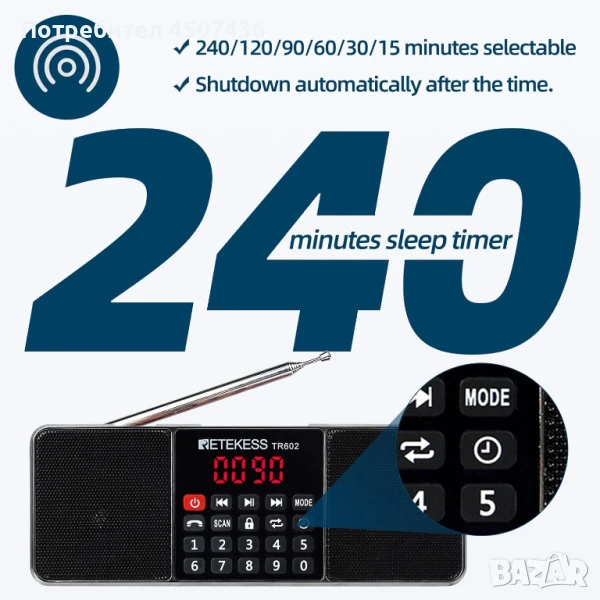 MP3 радио плейър с множество функции; можете да използвате бутона MODE, за да превключвате AM/FM/TF/USB/AUX и други функции; може да се използва като музикален плейър или като високоговорител