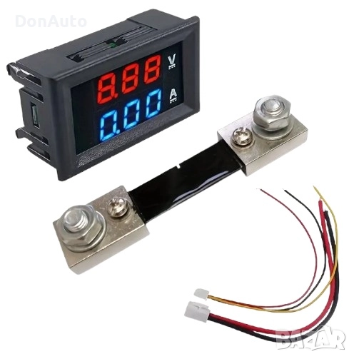 Цифров волтметър-амперметър с двоен LED дисплей – 10A / 50A / 100A, измерване на ток и напрежение до 100V, с шунт за автомобили, соларни системи и DIY проекти