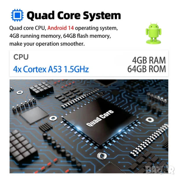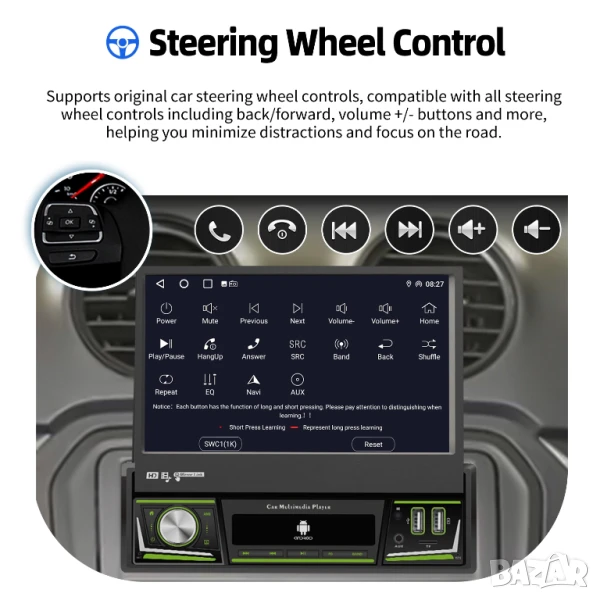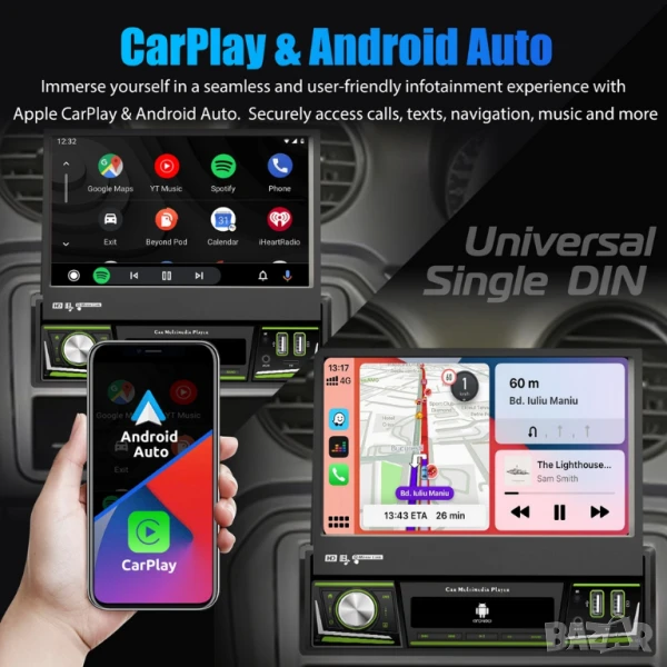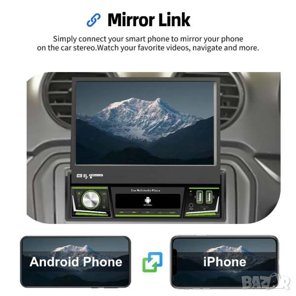 7” 1-DIN мултимедия с Android 14 и изваждащ се дисплей, RDS, 4GB/64GB, CarPlay AndroidAuto