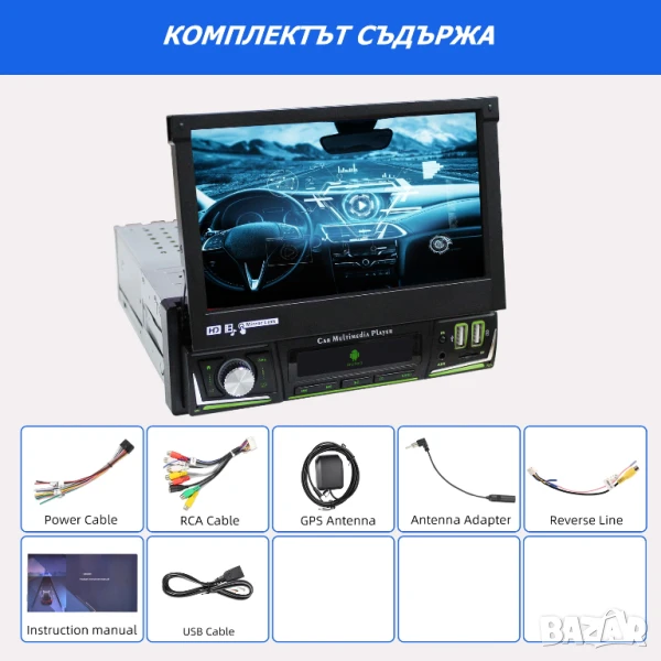 7” 1-DIN мултимедия с Android 14 и ръчно изваждащ се дисплей