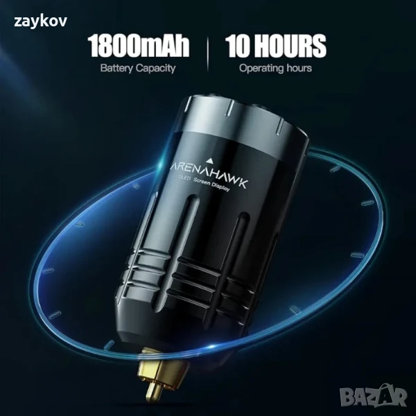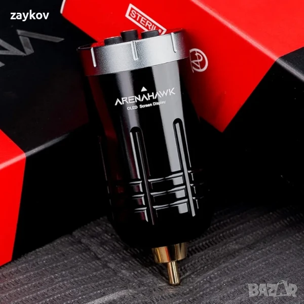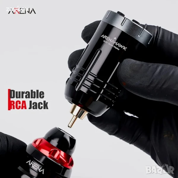 Безжичното захранване за татуировки Arenahawk е изработено от алуминиева сплав, подходящо за всички стандартни RCA интерфейси, за да бъде свързано към машината за татуировки безопасно и удобно.