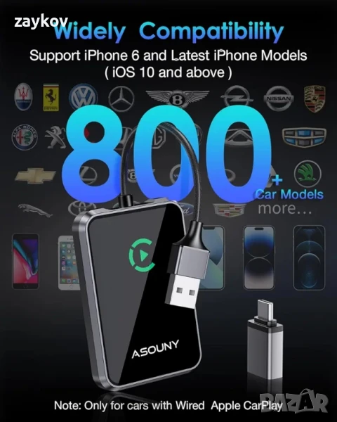 Безжичен CarPlay адаптер ASOUNY: Лесно надстройте кабелния CarPlay до безжичен и се насладете на свободата на безжичния CarPlay. Можете да навигирате, да използвате Siri, да осъществявате повиквания и да се наслаждавате на любимите си песни с превъзходна безжична свързаност. Изпитайте силата на интелигентната свързаност, без да правите компромис с оригиналната озвучителна система на вашия автомобил.