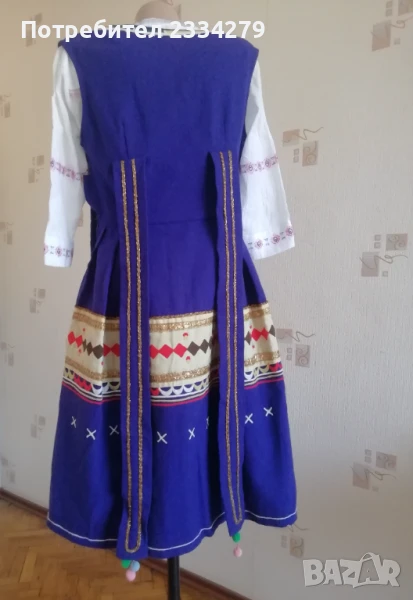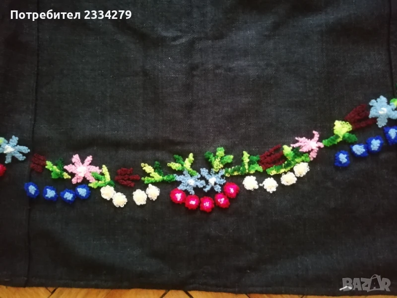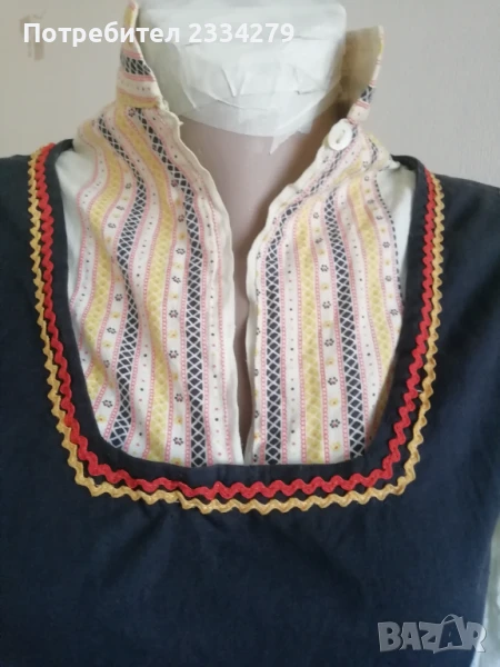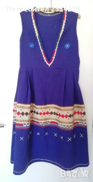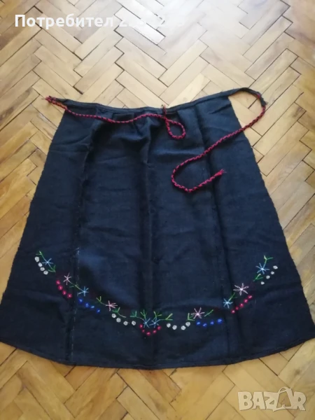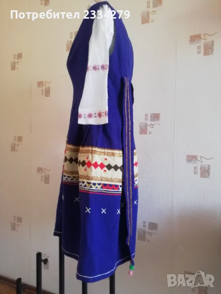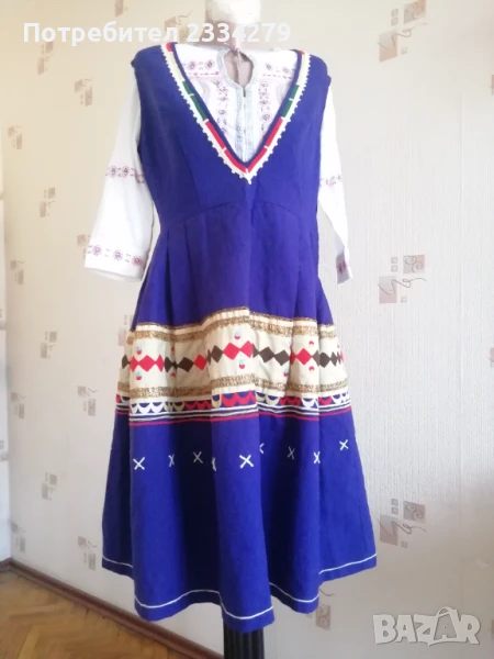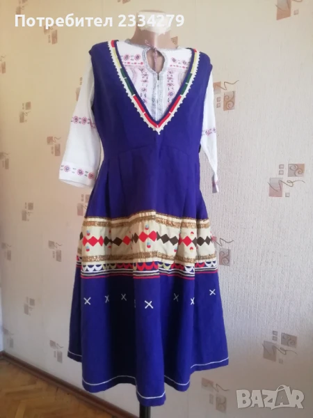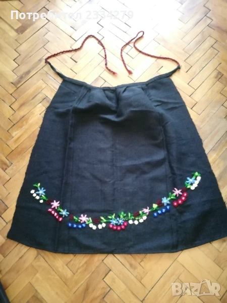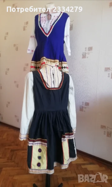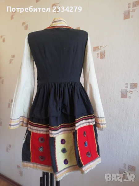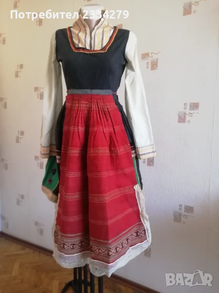 носия, черна с пришити към него ръкави и яка с деколте, 100%автентичен,изработен през 60-70години, използван в ансамбли или певчески групи в читалища и школи, размери дължина 95см.,рамена 39см.,гръдна обиколка 90см., талия обиколка 75см., цена 25€.(няма разкъсано или проядено подходящ за носене, колекция или декорация на битова къща, механа, витрина (В ЦЕНАТА НЕ ВЛИЗА ПРЕСТИЛКАТА!) ; N:2 женски сукман с орнаменти от ТРОНСКИЯТ край, два броя изработени през 60-те години с размери: дължина 1м., рамена 40см., гръдна обиколка 87см., талия обиколка 85см., цена за брой 30€. ( В ЦЕНАТА НЕ ВЛИЗАТ ПРИСТИЛКАТА И РИЗАТА! ) Годен за носене, колекция или декорация на битова къща.; N:3