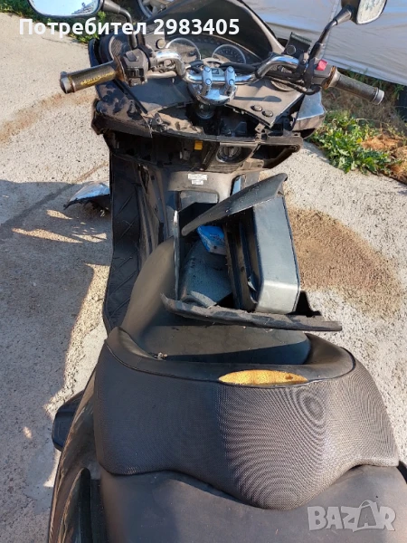Скутера е бракуван след лека катастрофа,работи перфектно и се движи но рамата е крива,счупени крачета за захващането на фаровете и корите