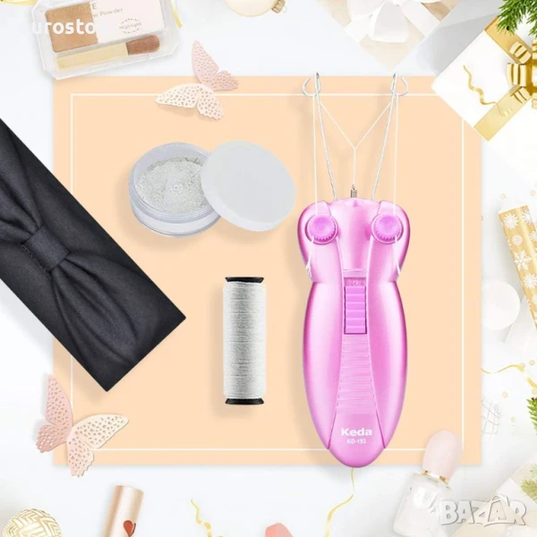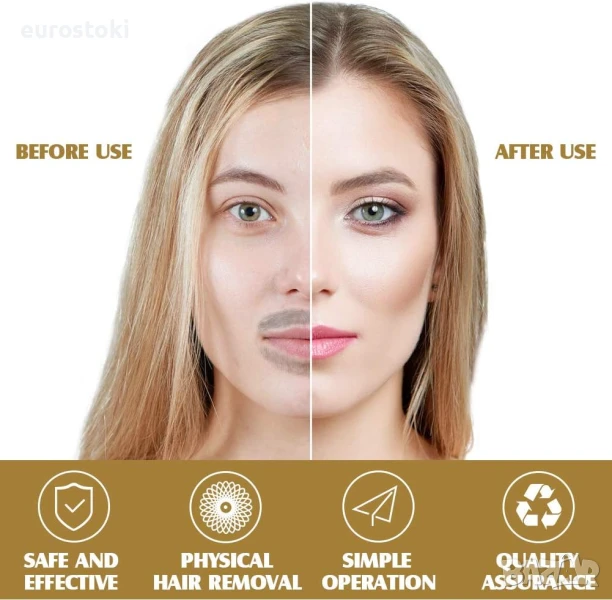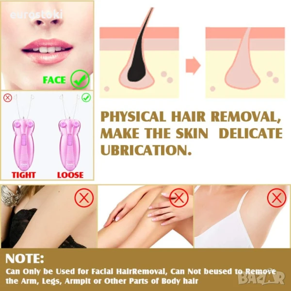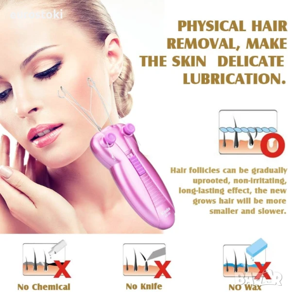 Традиционният уред за премахване на окосмяване по лицето използва физическо устройство за издърпване на лицевото окосмяване. Това е безопасен и бърз начин за премахване на окосмяването по лицето и предпазване от раздразнения и алергии. Идеален за всички типове кожа, най-добрият естествен и здравословен начин за обезкосмяване.
