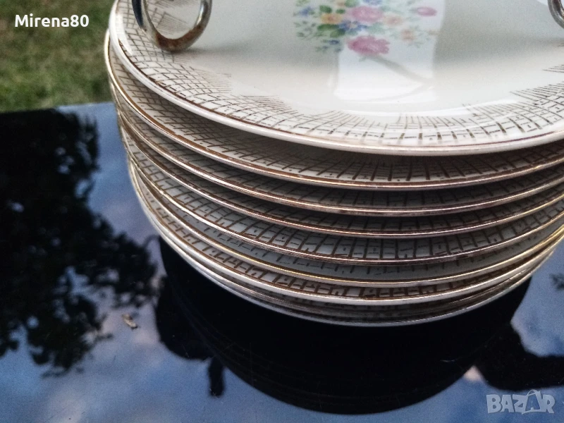 Великолепни чинии, произведени в Бавария през втората половина на миналия век. Основният цвят е екрю - в комбинация с разкошен полски букет и богат златен филигран. Много красиви ! Диам. 17 см, отлично състояние. Налични - 10 бр., мога да ги разделя на 6 и 4 по желание.
