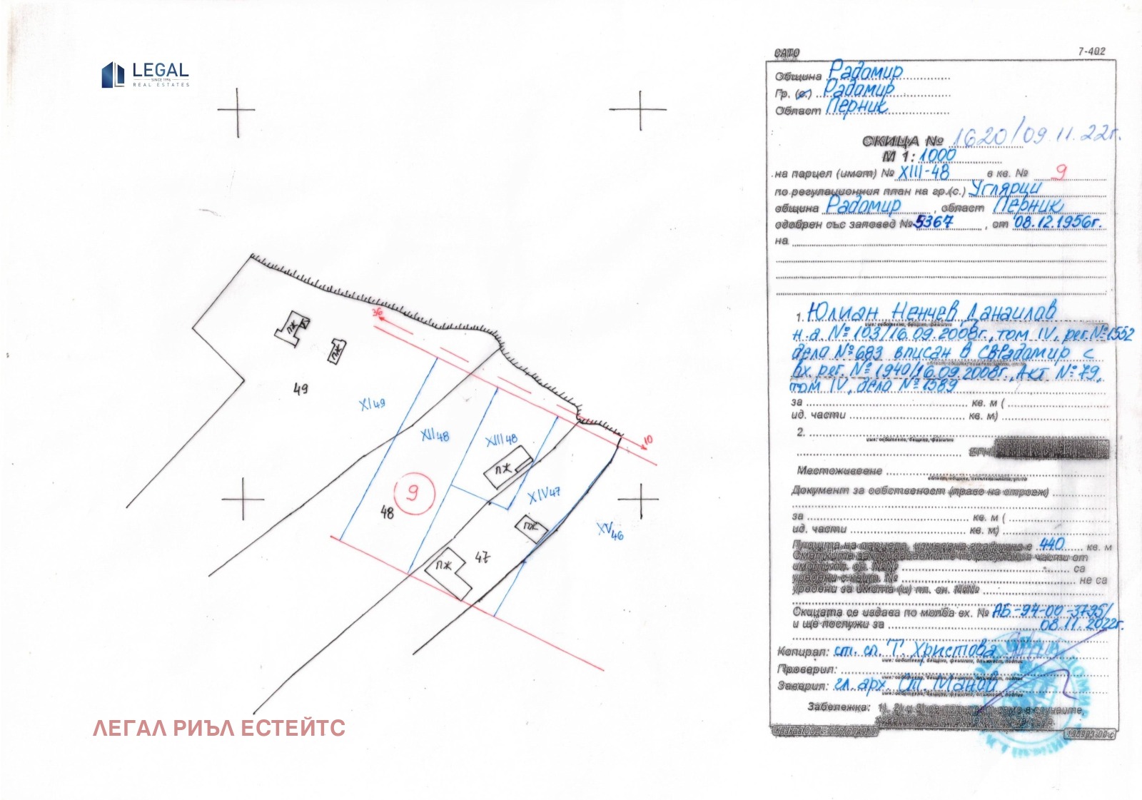 LEGAL REAL ESTATES продава парцел в село Углярци, община Радомир, област Пернишка с площ от 440 кв.м, представляващ УПИ XIII 48. Парцелът се намира в края но селото, непосредствено до къщи, в които се живее целогодишно. Лесен достъп по главна улици и 250 метра черен път, ток и вода в съседство.