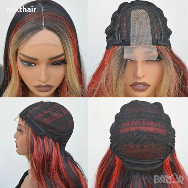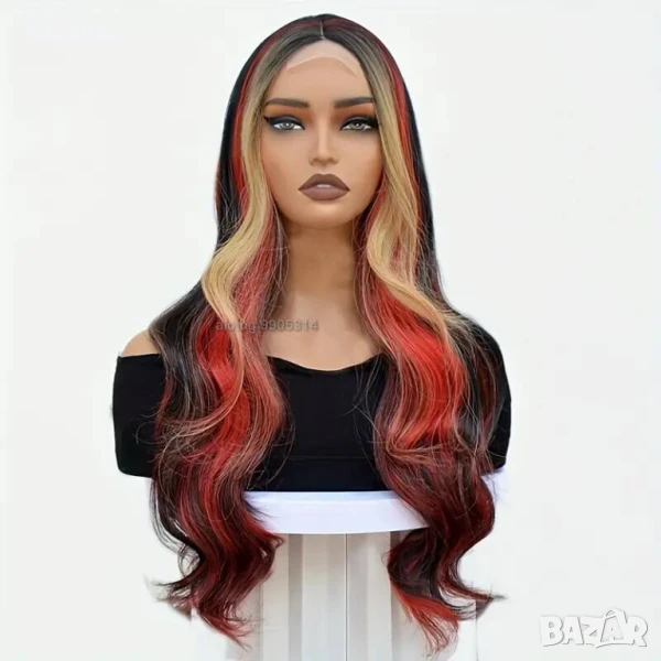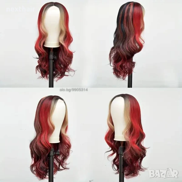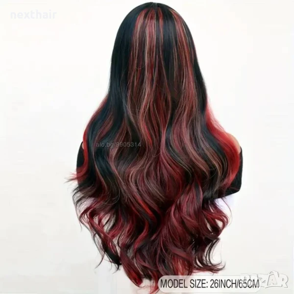 Вълнообразна перука с кичури микс от цветове русо червено черно на път → Обява 51232085