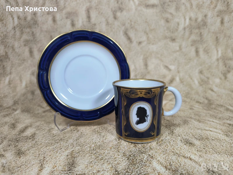 Чаша за кафе от немски порцелан Weimar, подглазурно кобалтово изрисуване, ръчно декорирана с позлата и профилът на Моцарт.