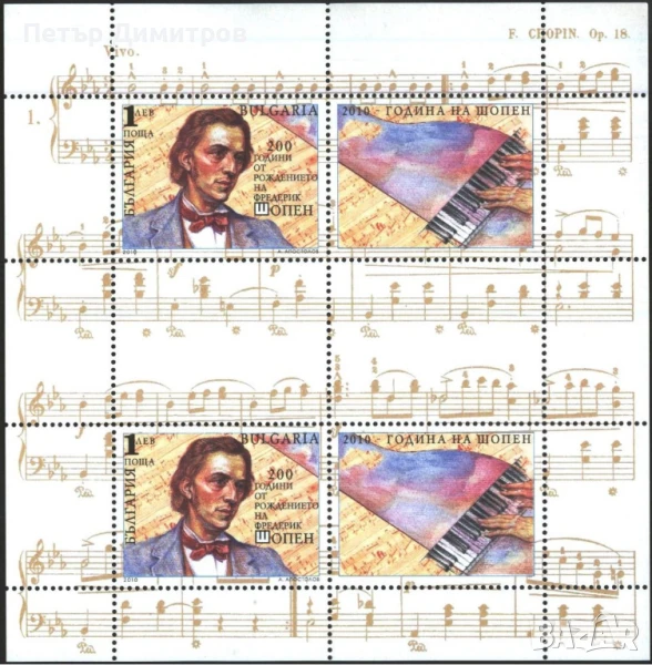 1. Чиста марка + винетка Фредерик Шопен 2010 от България. Тираж 15000. Цена 3.00 лева (сн. 1)