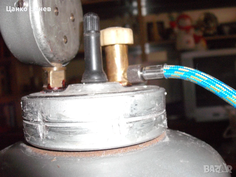 Бутилката е оборудвана с автомобилен вентил, манометър и кранче