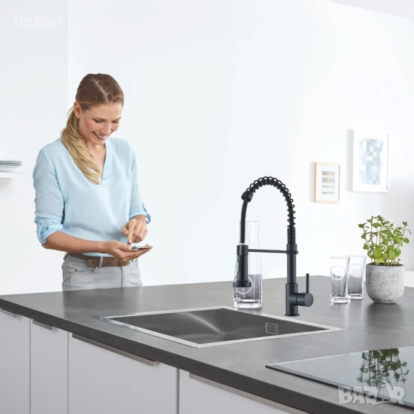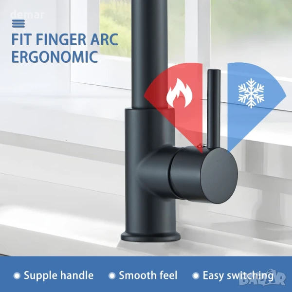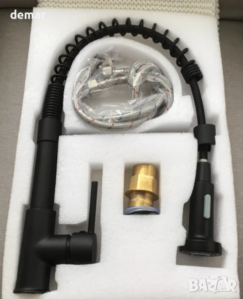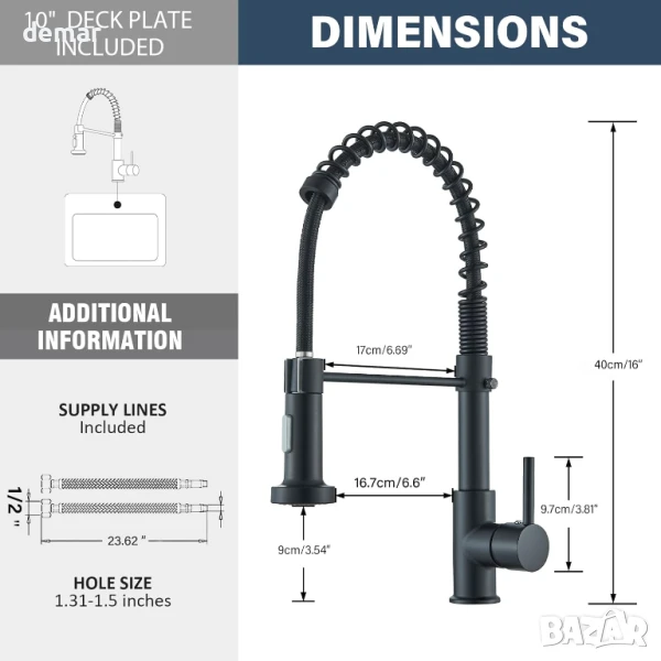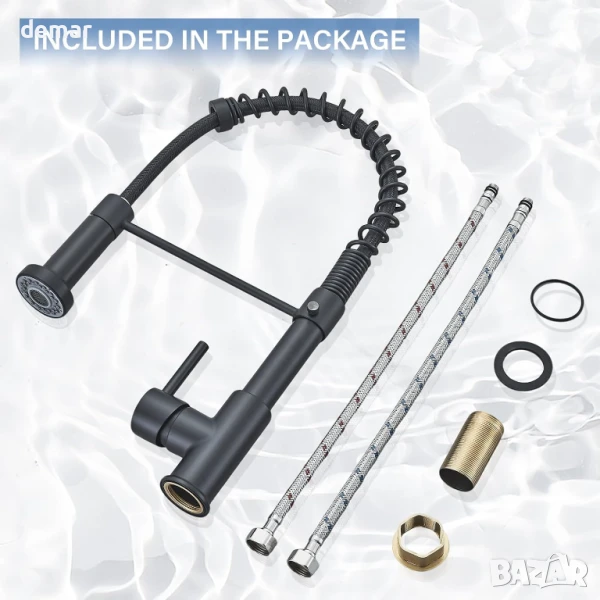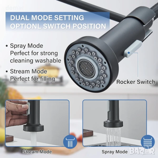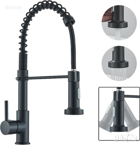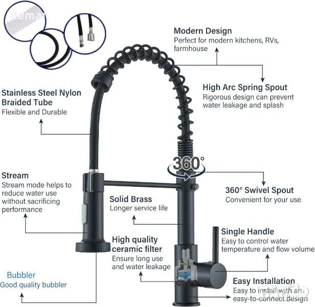 Този висококачествен кухненски смесител е изработен от издръжлив, безоловен месинг с пружинен дизайн и керамичен клапан, тестван за дългосрочна употреба без прокапване. Предлага два режима на пръскане – аерирана струя и мощно изплакване – лесно превключващи се с бутон, и въртящ се на 360° чучур за пълно покритие на мивката. Матовото черно покритие е устойчиво на ръжда, петна, пръстови отпечатъци и водни петна, осигурявайки по-чист вид. Доставя се с монтажни части и маркучи, проектиран е за лесен монтаж „Направи си сам“ без водопроводчик.