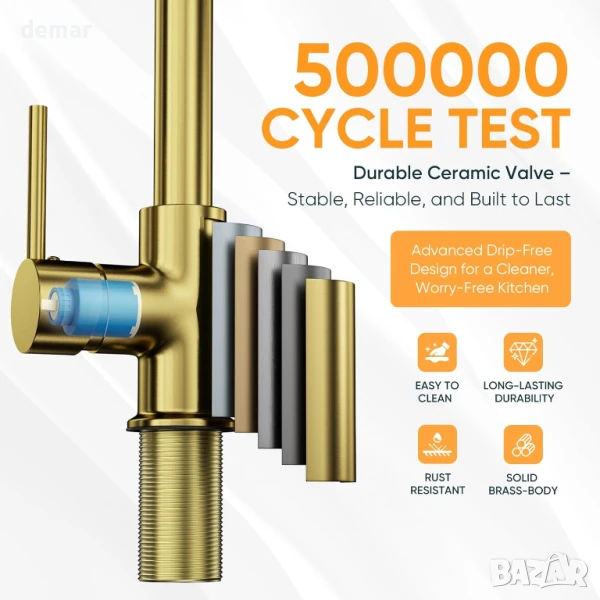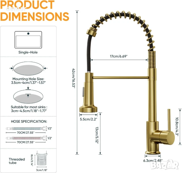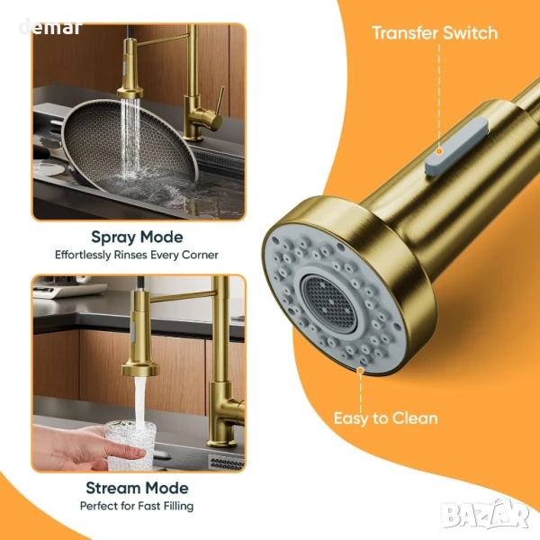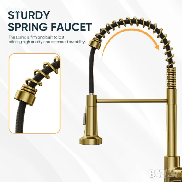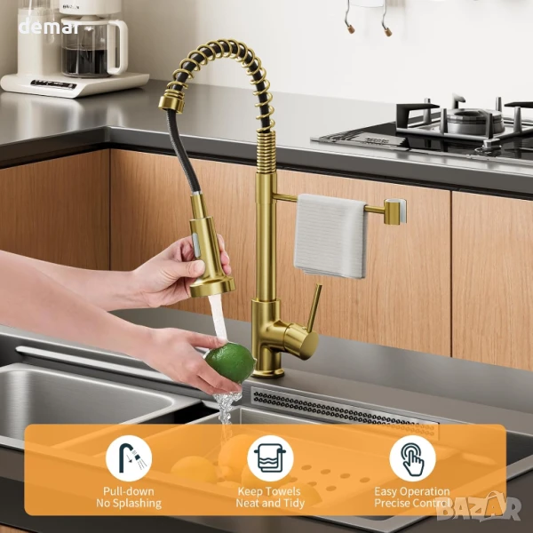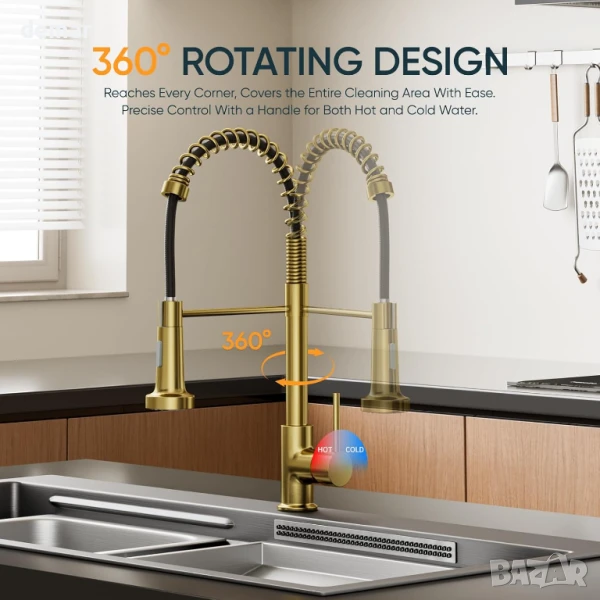 Този кухненски смесител е с двойна функция - издърпващ се надолу чучур с режими на струя и пръскане за ефективно пълнене и изплакване, висок извивка, въртящ се на 360° чучур за гъвкав достъп до мивката и издръжлива конструкция от безоловен месинг с устойчиво на корозия покритие в цвят матирано злато. Включва стандартни маркучи и всички необходими монтажни елементи за лесен монтаж „Направи си сам“.