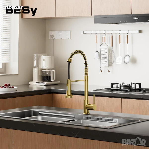 Кухненски смесител за мивка BESy - матово злато, 2 функции и издърпващ се чучур