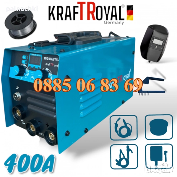 Комбинирана система за ММА (електродно) и MIG/MAG (с телоподаване) заваряване. Заварява с тел с диаметър 0.6, 0.8, 1.0 и 1.2 мм, както и с електроди от 2.5 до 5 мм. Регулируем заваръчен ток от 20 до 350А с плавно управление. Подходящ за ролки с тел до 1 кг – удобен и икономичен за работа на място. Оборудван със защита от пренапрежение, прегряване и претоварване.